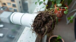 Entupimento de raiz no cano NFT com vazão reduzida e matéria orgânica; removi com sonda de aço 3mm e lavagem em pressão, secagem e vedação com fita de PTFE